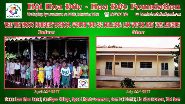 Tuesday morning, July 25th 2017, Hoa Đức Foundation and The Bureau of Education & Training in Dam Doi District inaugurated and handed over the Tan Ngoc Nursery School with 02 new classrooms: 15m length, 14m width & 02 new toilet for parents and pupils at Lam Trung Thien canal, Tan Ngoc Village, Ngoc Chanh Commune, Dam Doi District, Ca Mau Province, Viet Nam. Sponsored by: People's Committee Dam Doi District, Quan Am Foundation, Anonymous Benefactor from Sai Gon, Mr. Kevin & Miss Kimberly, Anonymous Sister, Ms. Lam Bao Thuyen, Ms. Ngoc & Ms. Thuy, Mrs. Vợ Chồng Ca Hát & her Friends, Anonymous Sister, Ms. Vo Giai Hue, Anonymous Sister from Tay Ninh, Ms. Le Thi Ngoc Tu, Ms. Tran Thi Phuong Thao, Ms. Belle Tam Nguyen Family, Miss Dang Quoc Anh, Anonymous sister from District 1- Sai Gon, Cu Thanh Shop, Ms. Diem from Ca Mau and Intax Chartered Accountants, The total value: VND 452 million.