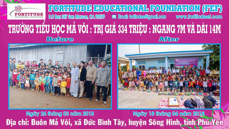Monday morning, June 18th 2018, Fortitude Educational Foundation, Hoa Đức Foundation and The Bureau of Education & Training in Song Hinh District inaugurated and Duc Binh Tay commune local authorities handed over the Ma Voi Primary School with 02 new classrooms: 14m length, 7m width, playground & new toilet for parents and pupils at Ma Voi village, Duc Binh Tay Commune, Song Hinh District, Phu Yen Province, Viet Nam. Sponsored by: Fortitude Educatinal Foundation, Duc Binh Tay commune local authorities and Ma Voi village people. The total value: VND 334 million.