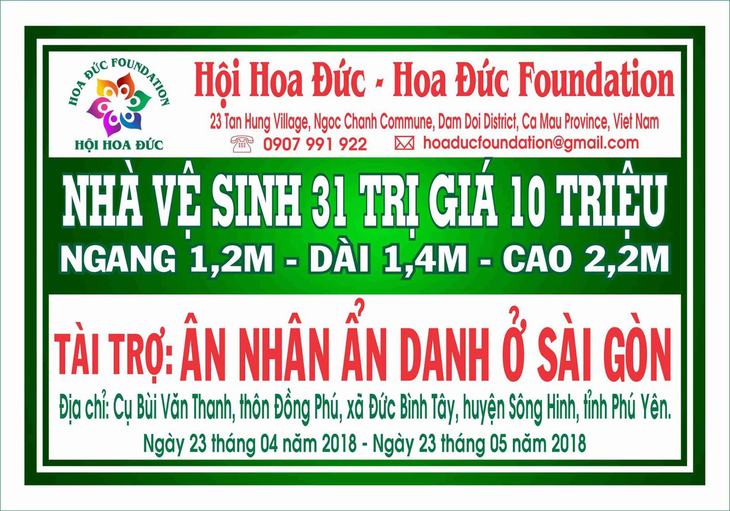 Wednesday morning, May 23rd 2018. Hoa Đức Foundation, Dong Phu Pagoda have donated 04 new toilets 31, 32, 33 & 34: 1.2 m width - 1.4m length - 2.2m height for 04 poor households in Duc Binh Tay commune, Song Hinh district, Phu Yen province, Viet Nam. Sponsored by Anonymous Benefactor from Sai Gon. Total value: VND 40 million (this price includes wage workers).