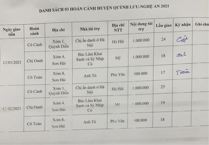 - Mr. Tu from Phu Yen: VND 500,000 for Mrs. Toan family.