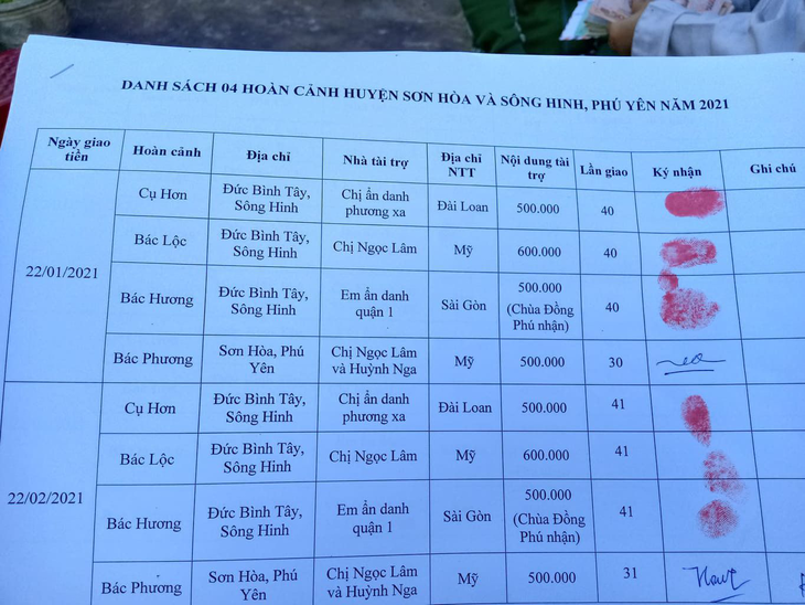 - Anonymous sister from Sai Gon: VND 500,000 for Mrs. Huong.