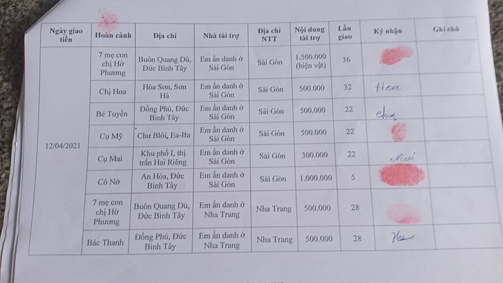 - Anonymous Sister from Sai Gon: VND 4.3 million for Mrs. Ho Phuong family (VND 1.5 million), Ms. Hoa (VND 500,000), Baby. Tuyen (VND 500,000), Mr. My (VND 500,000), Mrs. Mai (VND 300,000) & Mrs. No (VND 1 million).