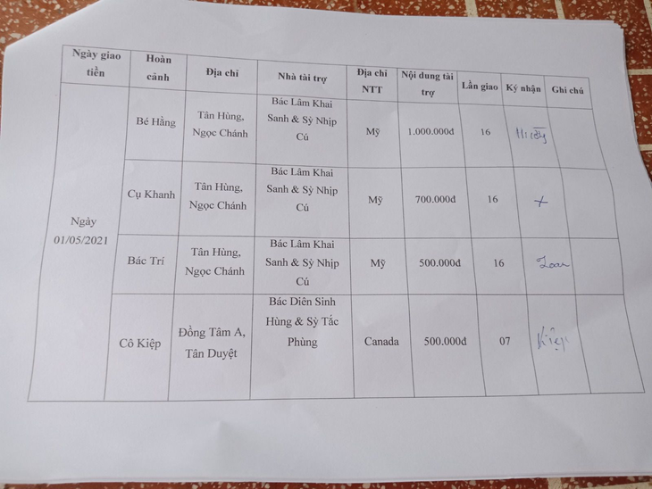 - Mr. Lam Khai Sanh & Mrs. Sy Nhip Cu: VND 1 million for Hang, VND 700,000 for Mrs. Khanh family & VND 500,000 for Mr. Chi family.