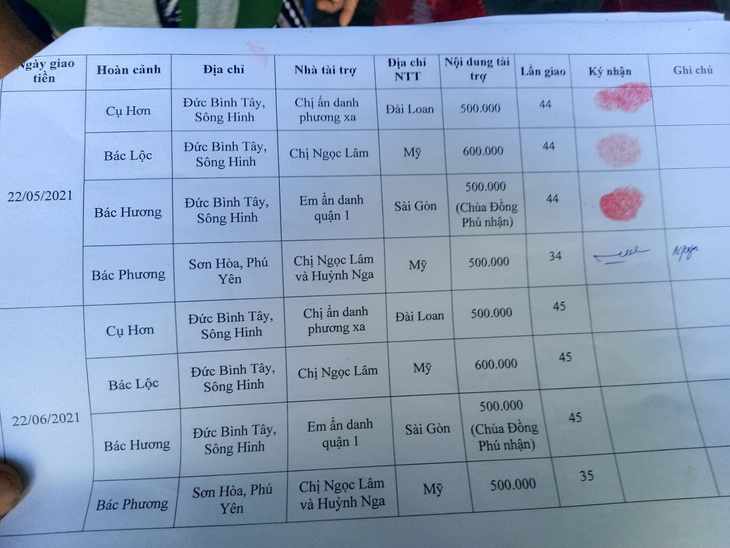 - Anonymous sister from Sai Gon: VND 500,000 for Mrs. Huong.