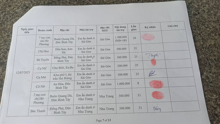 - Anonymous Sister from Nha Trang: VND 1 million for Mrs. Ho Phuong family (VND 500,000) and Mr. Thanh (VND 500,000).