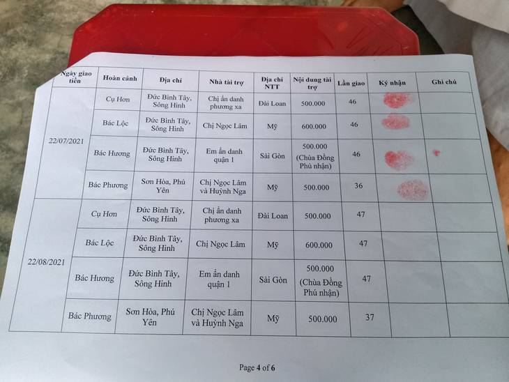 - Anonymous sister from Sai Gon: VND 500,000 for Mrs. Huong.