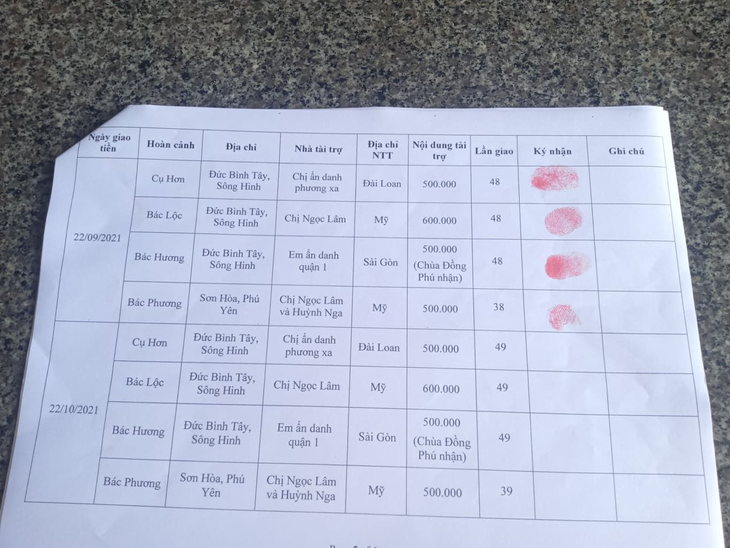 - Anonymous sister from Sai Gon: VND 500,000 for Mrs. Huong.