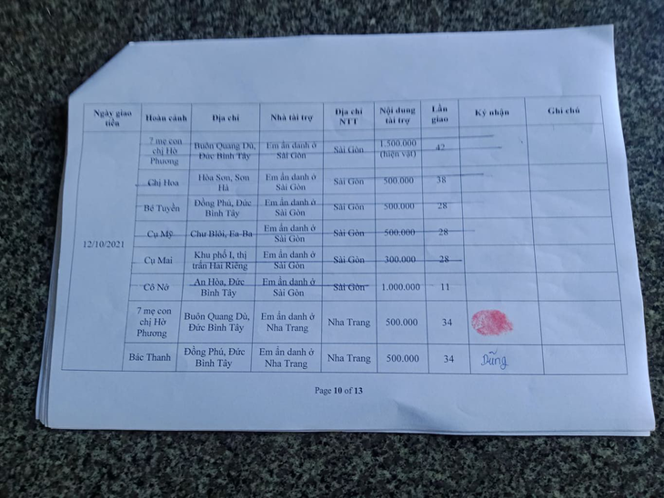 - Anonymous Sister from Nha Trang: VND 1 million for Mrs. Ho Phuong family (VND 500,000) and Mr. Thanh (VND 500,000).
