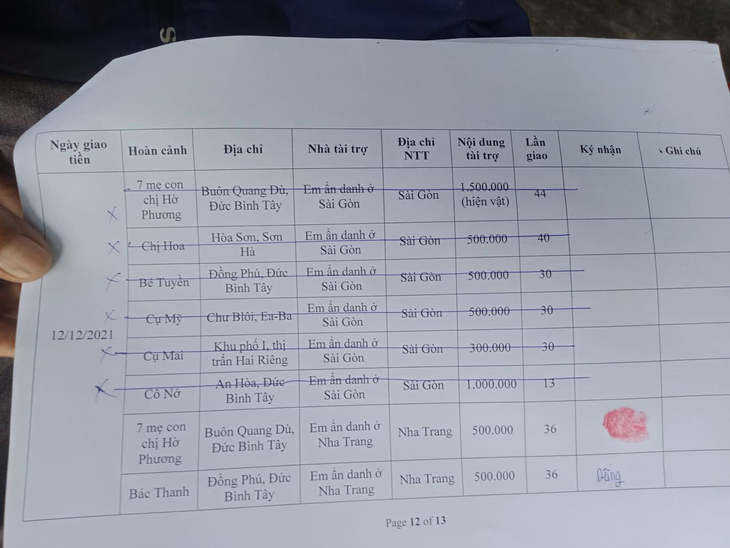 - Anonymous Sister from Nha Trang: VND 1 million for Mrs. Ho Phuong family (VND 500,000) and Mr. Thanh (VND 500,000).