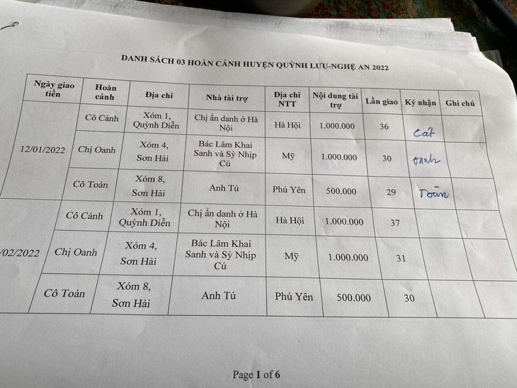 - Mr. Tu from Phu Yen: VND 500,000 for Mrs. Toan family.