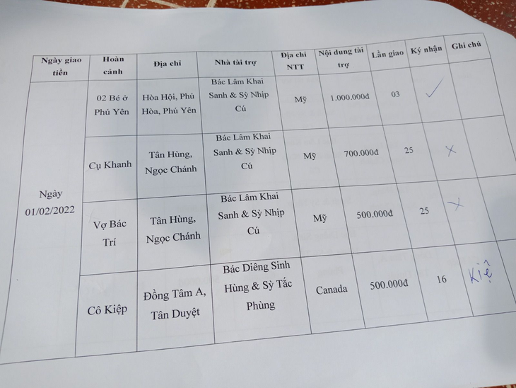 - Mr. Dieng Sinh Hung & Mrs. Sy Tac Phung: VND 500,000 for Mrs. Kiep family.