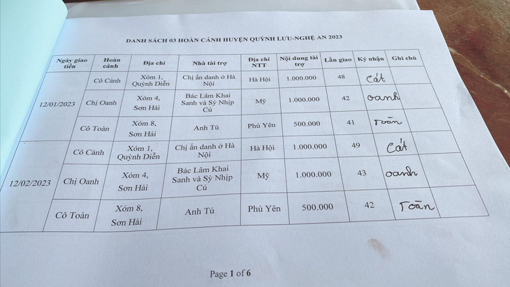 - Mr. Tu from Phu Yen: VND 500,000 for Mrs. Toan family.