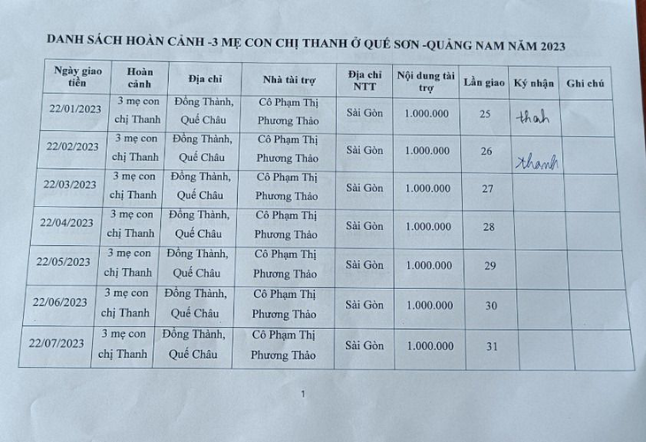 2. Case: Ms. Truong Thi Thanh: Born in 1990, her husband recently passed away, raising two children alone, her family is poor. She has a heart condition, her nerves are unstable, she is also often sick and has no means of production, unable to take care of her two children in school and need help VND 1 million monthly.
