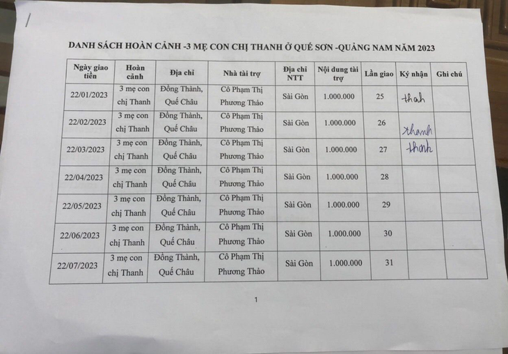 2. Case: Ms. Truong Thi Thanh: Born in 1990, her husband recently passed away, raising two children alone, her family is poor. She has a heart condition, her nerves are unstable, she is also often sick and has no means of production, unable to take care of her two children in school and need help VND 1 million monthly.