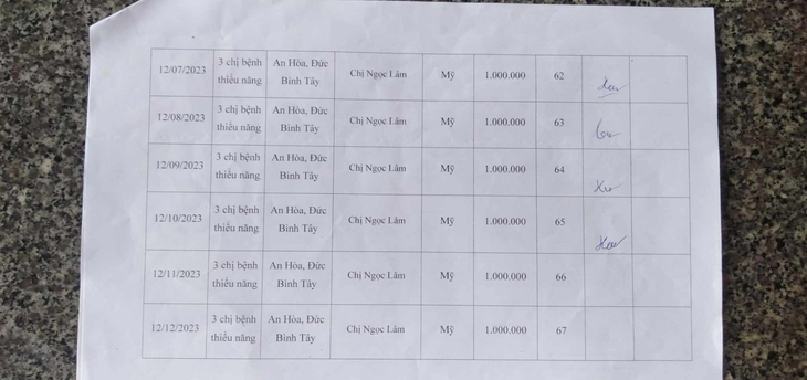 12-10-2023, Hội Hoa Đức và Chùa Đồng Phú đã giao số tiền lần 65 là 1.000.000VNĐ của Chị Ngọc Lâm gửi tặng hàng tháng cho Gia đình Bác Nguyễn Thị Tuyết Hoa có 03 con bệnh khờ ở thôn An Hòa, xã Đức Bình Tây, huyện Sông Hinh, tỉnh Phú Yên để mua gạo & thuốc.