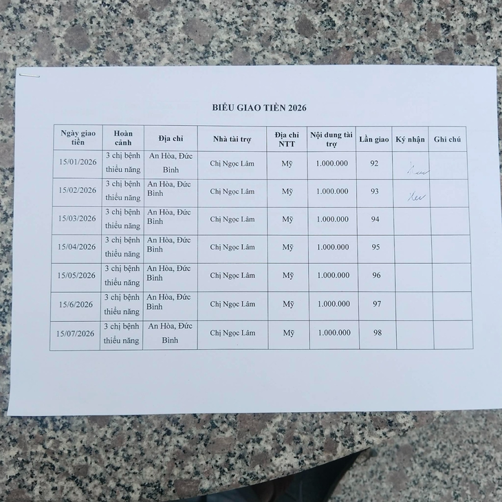 15-02-2026, Hội Hoa Đức và Chùa Đồng Phú đã giao số tiền lần 93 là 1.000.000VNĐ của Chị Ngọc Lâm gửi tặng hàng tháng cho Gia đình Bác Nguyễn Thị Tuyết Hoa có 03 con bệnh khờ ở thôn An Hòa, xã Đức Bình Tây, huyện Sông Hinh, tỉnh Phú Yên để mua gạo & thuốc.