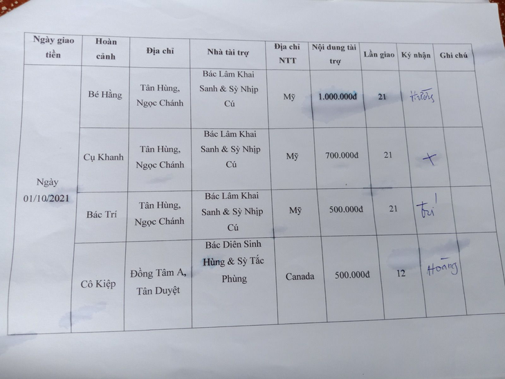 4. Hoàn cảnh 51: Gia đình Cô Nguyễn Bích Kiệp ở ấp Đồng Tâm A, xã Tân Duyệt, huyện Đầm Dơi, tỉnh Cà Mau được Bác Diêng Sinh Hùng và Sỳ Tắc Phùng tặng 500.000 VNĐ lần 12.