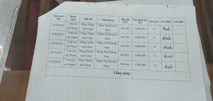 22-12-2021, Hội Hoa Đức đã giao số tiền lần 12 là 1.000.000 VNĐ của Cô Phạm Thị Phương Thảo tài trợ cho Gia đình Chị Thanh ở Đồng Thành, Quế Châu, Quế Sơn, Quảng Nam.