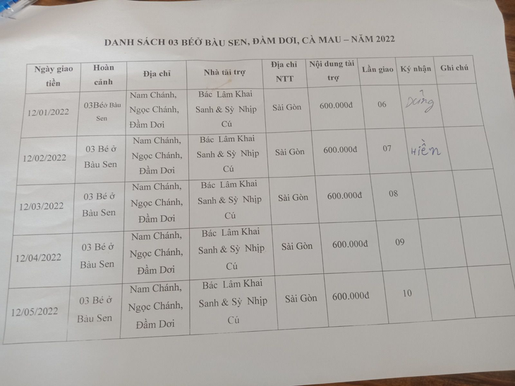 12-02-2022, Hội Hoa Đức đã giao số tiền 600.000VNĐ của Bác Lâm Khai Sanh & Sỳ Nhịp Cú gửi tặng hàng tháng lần 07 cho 03 Bé ở Bàu Sen, Nam Chánh, Ngọc Chánh, Đầm Dơi, Cà Mau. Hoàn cảnh Gia đình khó khăn, cần giúp tiền sữa và tiền học hàng tháng.