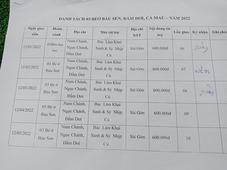 12-03-2022, Hội Hoa Đức đã giao số tiền 600.000VNĐ của Bác Lâm Khai Sanh & Sỳ Nhịp Cú gửi tặng hàng tháng lần 08 cho 03 Bé ở Bàu Sen, Nam Chánh, Ngọc Chánh, Đầm Dơi, Cà Mau. Hoàn cảnh Gia đình khó khăn, cần giúp tiền sữa và tiền học hàng tháng.