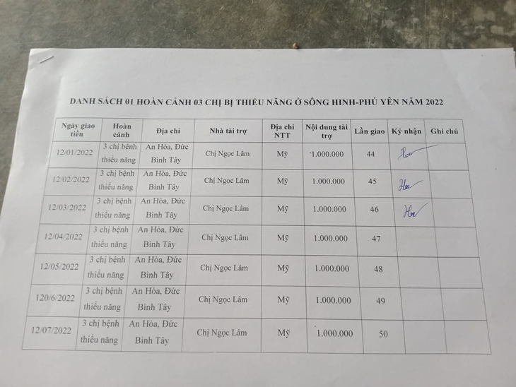 12-03-2022, Hội Hoa Đức và Chùa Đồng Phú đã giao số tiền lần 46 là 1.000.000VNĐ của Chị Ngọc Lâm gửi tặng hàng tháng cho Gia đình Bác Nguyễn Thị Tuyết Hoa có 03 con bệnh khờ ở thôn An Hòa, xã Đức Bình Tây, huyện Sông Hinh, tỉnh Phú Yên để mua gạo & thuốc.