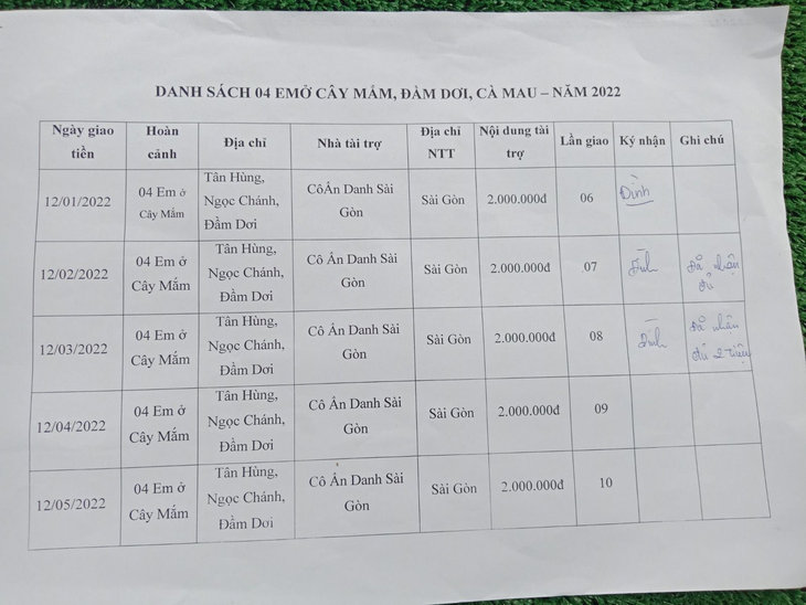 12-03-2022, Hội Hoa Đức đã giao số tiền 2.000.000VNĐ của Ân Nhân Ẩn Danh ở Sài Gòn tặng hàng tháng lần 08 cho 04 em ở Cây Mắm, Tân Hùng, Ngọc Chánh, Đầm Dơi, Cà Mau. 04 em này có hoàn cảnh khó khăn, cần giúp tiền lo việc học.