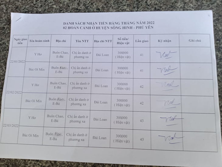 22-03-2022, Hội Hoa Đức, Chùa Đồng Phú và địa phương xã Ea-Bá đã giao hiện vật lần 43, trị giá 600.000 VNĐ của Chị Gái Ẩn Danh Phương Xa tặng cho hoàn cảnh 21 và 22. Mỗi hoàn cảnh nhận số hiện vật trị giá 300.000 VNĐ. Hiện vật được liệt kê rất chi tiết bằng hóa đơn có trong clip.