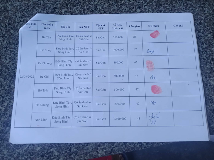 1. Bé Huỳnh Thanh Thư do Ân Nhân Ẩn Danh ở Sài Gòn tài trợ 200.000 VNĐ lần 23.