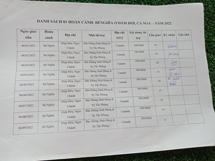 06-05-2022, Hội Hoa Đức đã giao số tiền 500.000VNĐ của Em Gái Ẩn Danh Phương Xa gửi tặng hàng tháng lần 06 cho Em Lê Hữu Nghĩa, 10 tuổi, học lớp 03, hoàn cảnh khó khăn, học giỏi, ở ấp Hiệp Hòa, xã Ngọc Chánh, huyện Đầm Dơi, tỉnh Cà Mau để lo việc học.