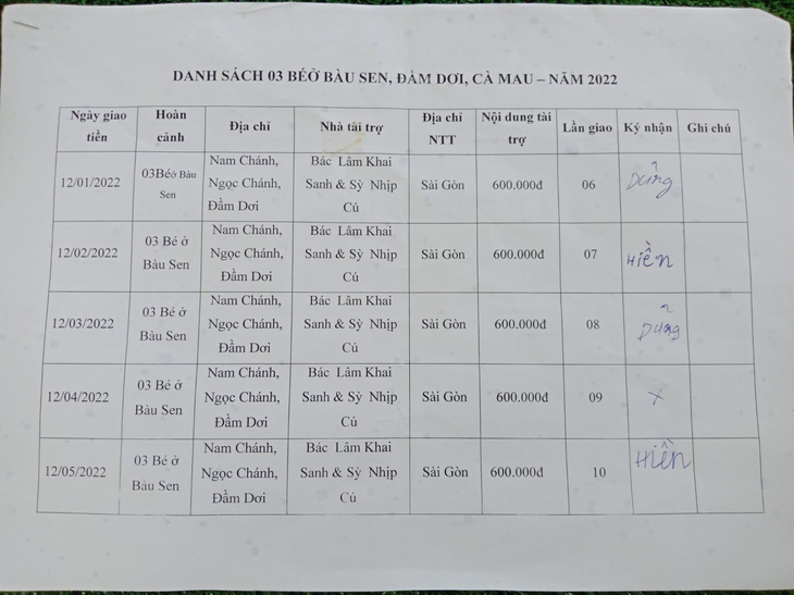 12-05-2022, Hội Hoa Đức đã giao số tiền 600.000VNĐ của Bác Lâm Khai Sanh & Sỳ Nhịp Cú gửi tặng hàng tháng lần 10 cho 03 Bé ở Bàu Sen, Nam Chánh, Ngọc Chánh, Đầm Dơi, Cà Mau. Hoàn cảnh Gia đình khó khăn, cần giúp tiền sữa và tiền học hàng tháng.