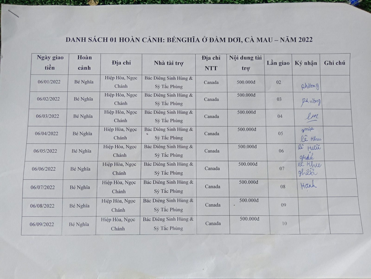 06-07-2022, Hội Hoa Đức đã giao số tiền 500.000VNĐ của Em Gái Ẩn Danh Phương Xa gửi tặng hàng tháng lần 08 cho Em Lê Hữu Nghĩa, 10 tuổi, học lớp 03, hoàn cảnh khó khăn, học giỏi, ở ấp Hiệp Hòa, xã Ngọc Chánh, huyện Đầm Dơi, tỉnh Cà Mau để lo việc học.