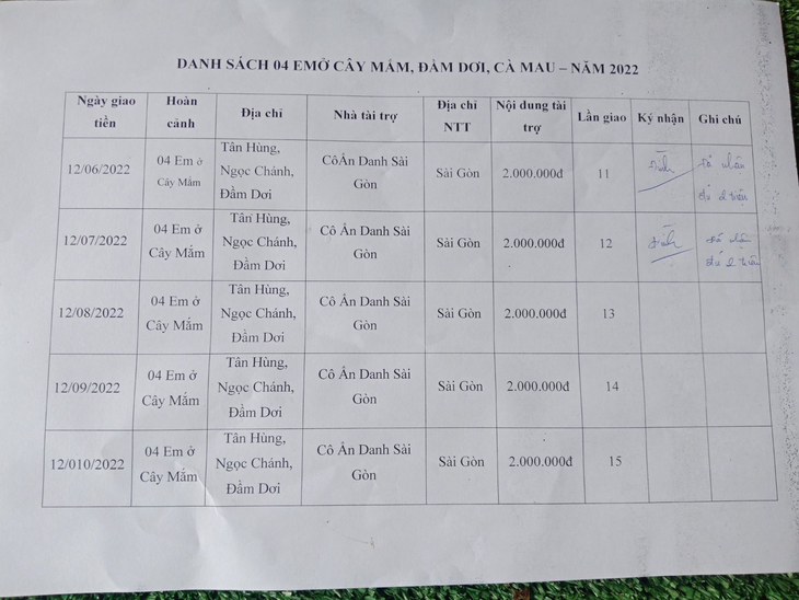 12-07-2022, Hội Hoa Đức đã giao số tiền 2.000.000VNĐ của Ân Nhân Ẩn Danh ở Sài Gòn tặng hàng tháng lần 12 cho 04 em ở Cây Mắm, Tân Hùng, Ngọc Chánh, Đầm Dơi, Cà Mau. 04 em này có hoàn cảnh khó khăn, cần giúp tiền lo việc học.