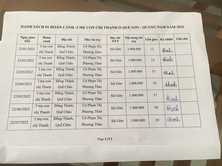 22-07-2022, Hội Hoa Đức đã giao số tiền lần 19 là 1.000.000 VNĐ của Cô Phạm Thị Phương Thảo tài trợ cho Gia đình Chị Thanh ở Đồng Thành, Quế Châu, Quế Sơn, Quảng Nam.