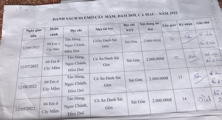 12-09-2022, Hội Hoa Đức đã giao số tiền 2.000.000VNĐ của Ân Nhân Ẩn Danh ở Sài Gòn tặng hàng tháng lần 14 cho 04 em ở Cây Mắm, Tân Hùng, Ngọc Chánh, Đầm Dơi, Cà Mau. 04 em này có hoàn cảnh khó khăn, cần giúp tiền lo việc học.