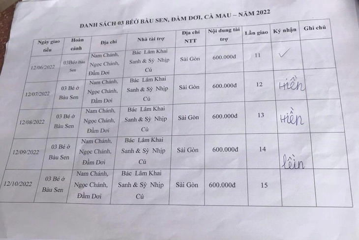 12-09-2022, Hội Hoa Đức đã giao số tiền 600.000VNĐ của Bác Lâm Khai Sanh & Sỳ Nhịp Cú gửi tặng hàng tháng lần 14 cho 03 Bé ở Bàu Sen, Nam Chánh, Ngọc Chánh, Đầm Dơi, Cà Mau. Hoàn cảnh Gia đình khó khăn, cần giúp tiền sữa và tiền học hàng tháng.