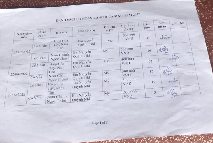 1. Hoàn cảnh 58: Cô Nhãn, 500.000 VNĐ, lần 03. Bệnh già, neo đơn, cần tiền mua thuốc và gạo hàng tháng. Nhà ở ấp Hiệp Hoa Tây, Ngọc Chánh, Đầ Dơi, Cà Mau.