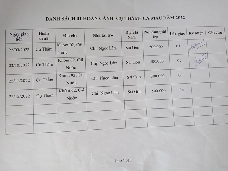 22-10-2022, Hội Hoa Đức đã giao số tiền lần 02 là 500.000 VNĐ của Chị Ngọc Lâm tài trợ cho Cụ Thắm 75 tuổi, neo đơn, bệnh già ở Khóm 04, Thị Trấn Cái Nước, huyện Cái Nước, tỉnh Cà Mau. Cụ cần tiền mua thuốc uống hàng tháng.