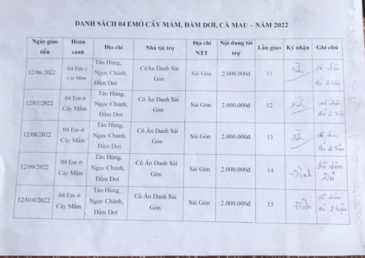12-11-2022, Hội Hoa Đức đã giao số tiền 2.000.000VNĐ của Ân Nhân Ẩn Danh ở Sài Gòn tặng hàng tháng lần 16 cho 04 em ở Cây Mắm, Tân Hùng, Ngọc Chánh, Đầm Dơi, Cà Mau. 04 em này có hoàn cảnh khó khăn, cần giúp tiền lo việc học.