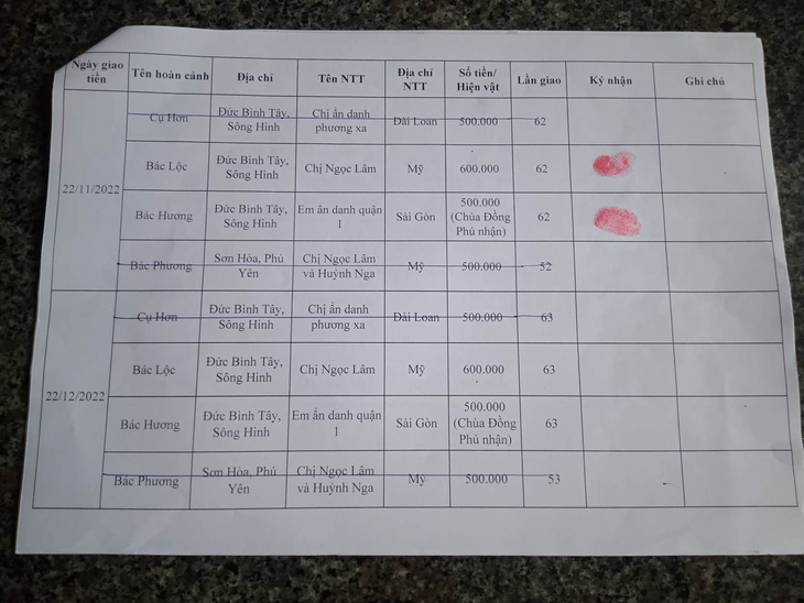 1. Lần 62 cho Bác Bùi Thị Lộc: 600.000VNĐ của Chị Ngọc Lâm.