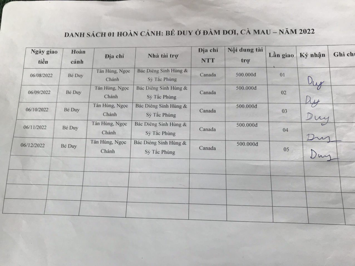 06-12-2022, Hội Hoa Đức đã giao số tiền 500.000VNĐ của Em Gái Ẩn Danh Phương Xa gửi tặng hàng tháng lần 05 cho Em Duy, 12 tuổi, học lớp 05, hoàn cảnh nghèo, ở ấp Tân Hùng, xã Ngọc Chánh, huyện Đầm Dơi, tỉnh Cà Mau để lo việc học.