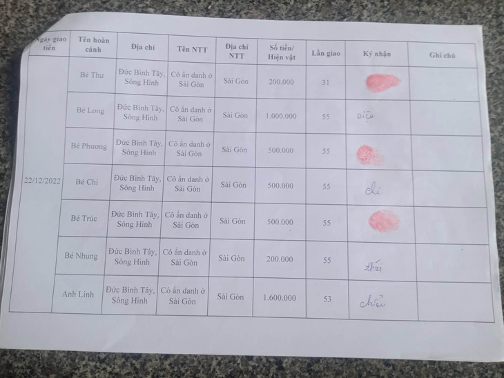 - 05 bé còn lại cũng do Ân Nhân Ẩn Danh ở Sài Gòn tài trợ 2.700.000 VNĐ lần 55. Cụ thể.