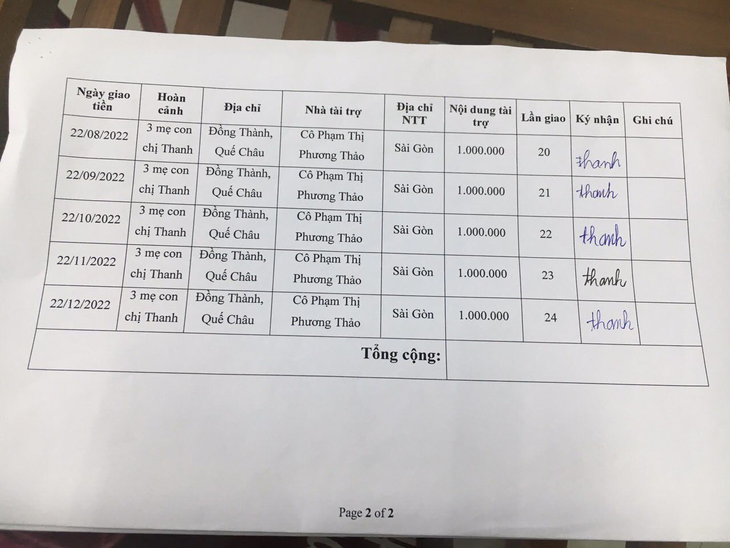 22-12-2022, Hội Hoa Đức đã giao số tiền lần 24 là 1.000.000 VNĐ của Cô Phạm Thị Phương Thảo tài trợ cho Gia đình Chị Thanh ở Đồng Thành, Quế Châu, Quế Sơn, Quảng Nam.