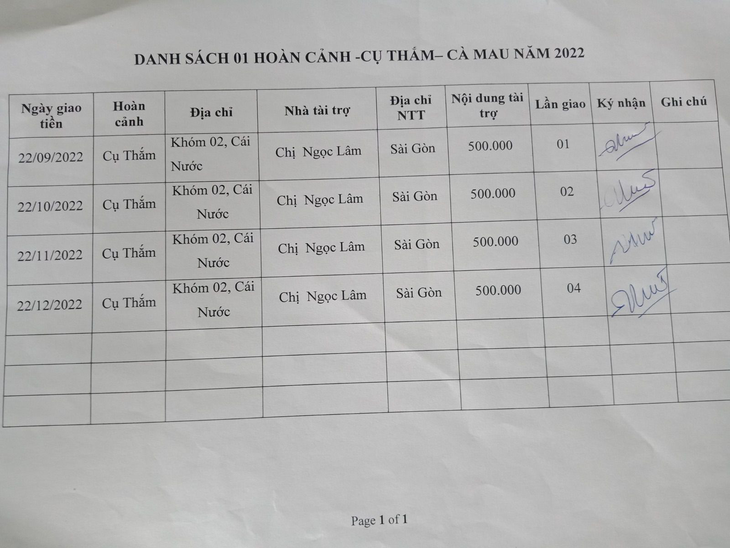 22-12-2022, Hội Hoa Đức đã giao số tiền lần 04 là 500.000 VNĐ của Chị Ngọc Lâm tài trợ cho Cụ Thắm 75 tuổi, neo đơn, bệnh già ở Khóm 04, Thị Trấn Cái Nước, huyện Cái Nước, tỉnh Cà Mau. Cụ cần tiền mua thuốc uống hàng tháng.