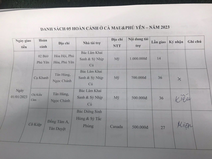3. Hoàn cảnh 51: Gia đình Cô Nguyễn Bích Kiệp ở ấp Đồng Tâm A, xã Tân Duyệt, huyện Đầm Dơi, tỉnh Cà Mau được Bác Diêng Sinh Hùng và Sỳ Tắc Phùng tặng 500.000 VNĐ lần 27.